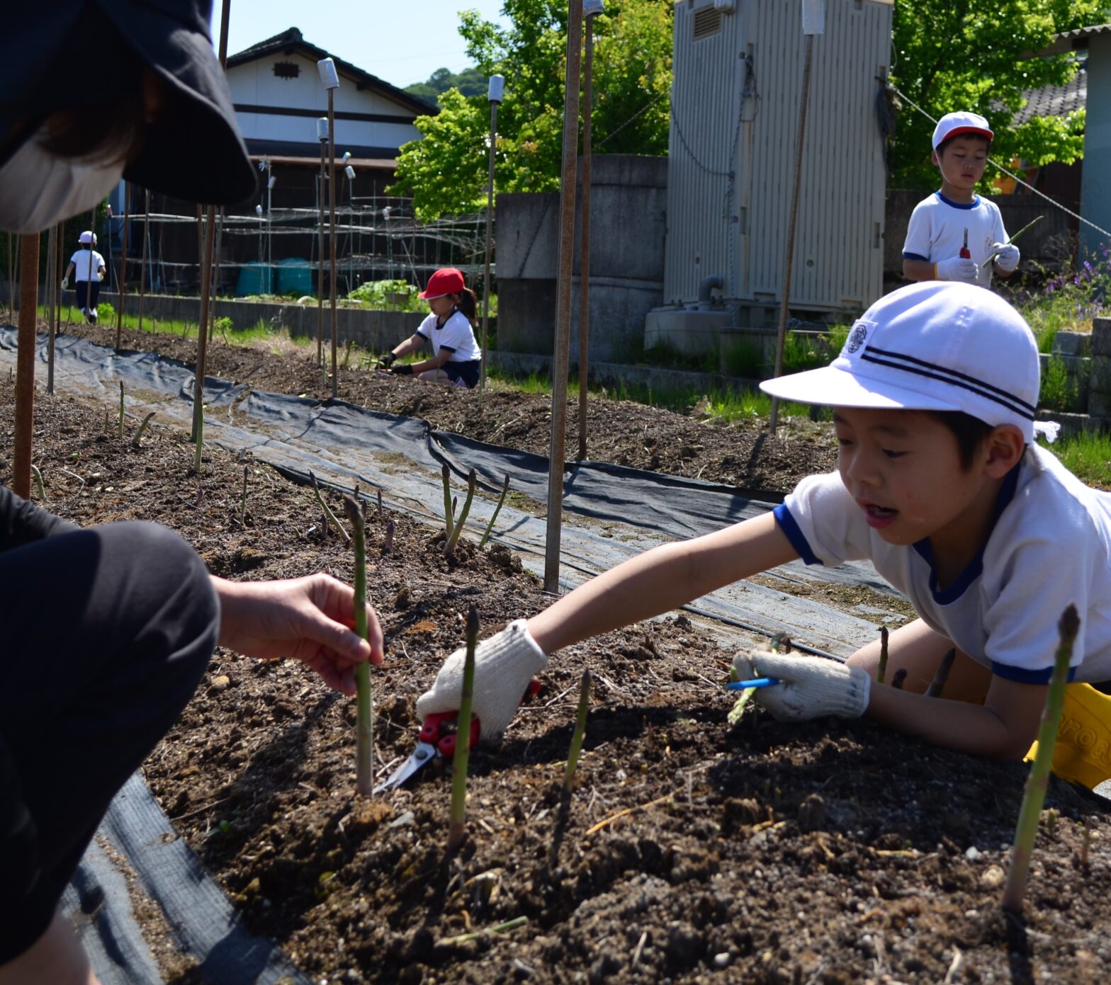 児童とアスパラガス収穫矢掛町立川面小学校は、「矢掛町ブランド」に認定された基幹作物アスパラガスを栽培するJA晴れの国岡山アスパラガス部会の山邊勝彦さんの園地で、収穫を体験しました。 |