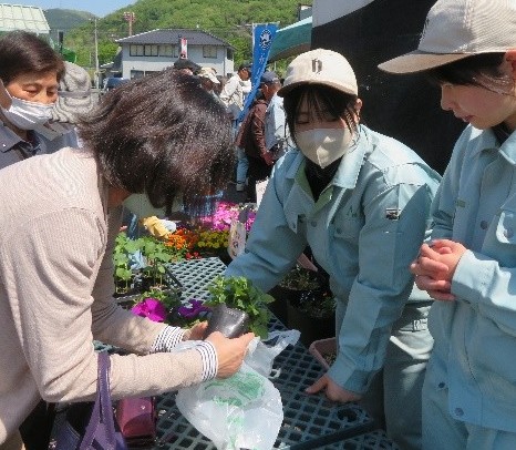 高校生が野菜苗・花苗を対面販売 地域とともに農を学ぶ県立新見高校生物生産科3年生12人が4月下旬にJAの生産資材店で野菜・花苗の販売実習を行いました。 |
