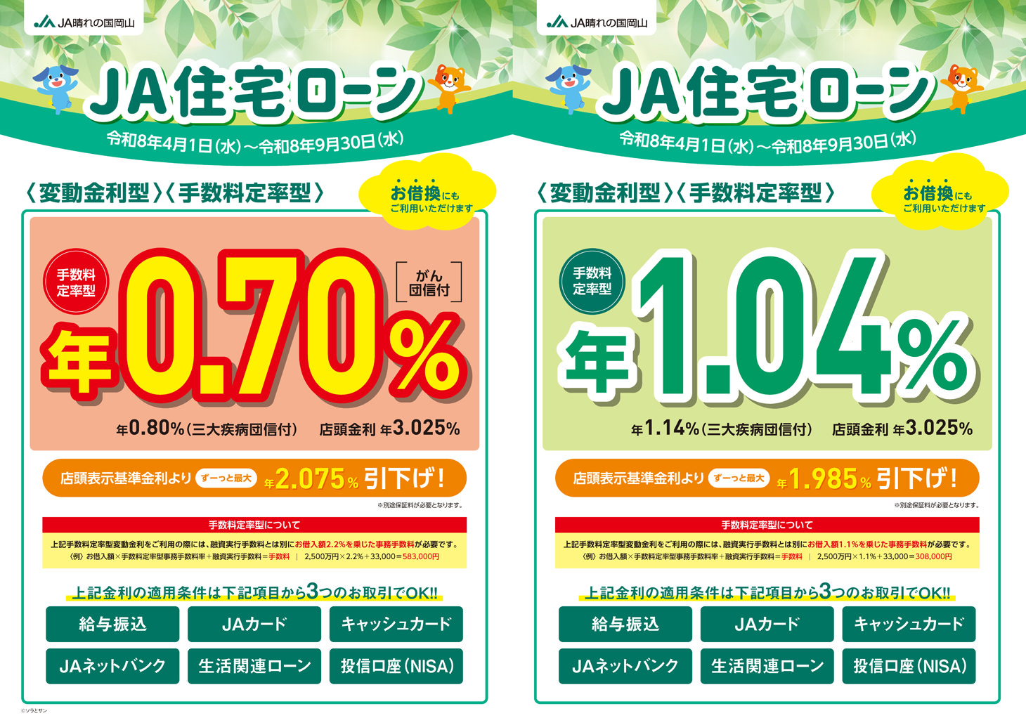 新築・増改築、建売住宅やマンションの購入など、JAの住宅ローンは、様々なお客さまのマイホームプランにお役立ていただけます。JAの住宅ローンは、返済方法・融資額・融資期間等を選択できます。ライフプランにあわせて、無理のない返済計画をご提案いたします。