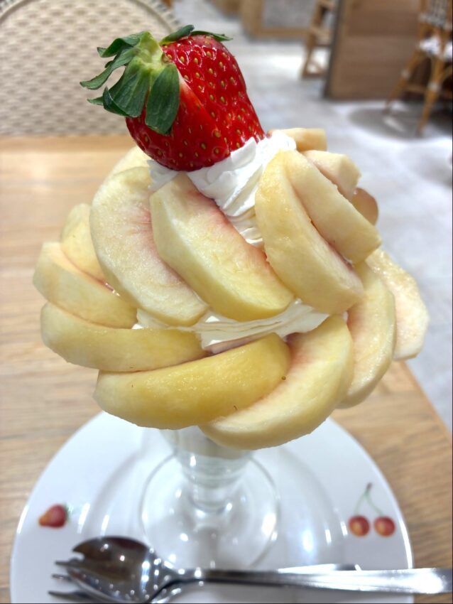 ラ・メゾン・アンソレイユターブル22店舗では見るも豪華なタルト、果実園リーベル15店舗ではモモをふんだんにのせたパフェ、麹町のパティシエシマではしっとり食感のケーキの販売が行われました。