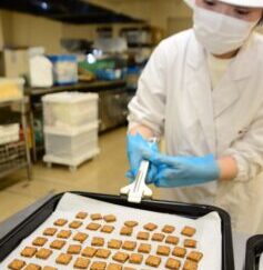 - アスパラガスにハムを巻き、さらに焼きのりを巻いて水で濡らしてとめる。その後、巻いた焼きのりの周りに米粉をまんべんなくまぶす