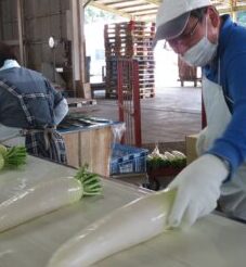 土から掘り出したダイコンは、日差しを受けたら品質が低下するので、農家は早朝2時から明け方まで収穫。JA選果場では葉を切り落として水洗いした後、形や姿、傷や病虫害をチェックし、長さを揃えて箱詰めします。