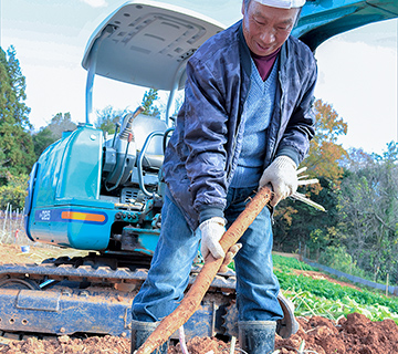 明治地区の粘土質の赤土畑は、手で握るとギュッと固まるくらい重粘(いわゆる「重い土」)なので、その性質上、養分を蓄える力が高く安定しており、作物がじっくりと力強く育ちます。特にゴボウは、じっくり育つほど肉質のやわらかさ、香りの高さ、日持ちの良さが優れる作物です。
