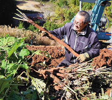 明治ごんぼうは、種まきから収穫適期までの期間が、一般的なゴボウと比べて2~3か月長く必要で、じっくり育つという粘土質土壌の特性が十分に生かされた、高品質なゴボウです。