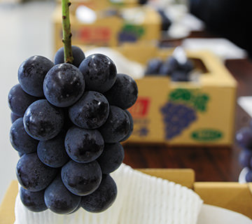 「誉乃」は赤坂地区の達人たちが技術の粋を集めて栽培し、糖度センサーによる糖度を保証したピオーネです。粒重16g以上で高糖度のものに厳選しています。