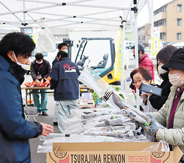 管内では、ゴボウと並んで倉敷市連島のレンコンが有名で、「連島れんこん」と呼ばれています。歴史も古く、出荷量は岡山県下No.1です。連島れんこんは、肌の色も白く、肉質もやわらかで大変おいしいレンコンです。食物繊維・ビタミン類が多く含まれ大変体に良い野菜です。