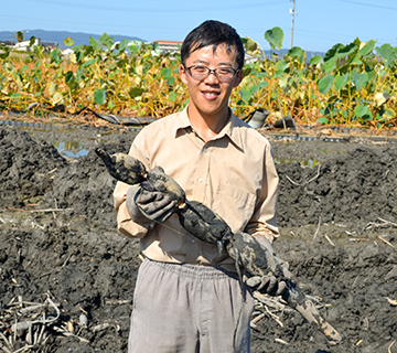 レンコンは粘土質の土壌で栽培し、じっくりと時間をかけて成長させます。連島れんこんは、手掘りで1本1本丁寧に掘り起こします。